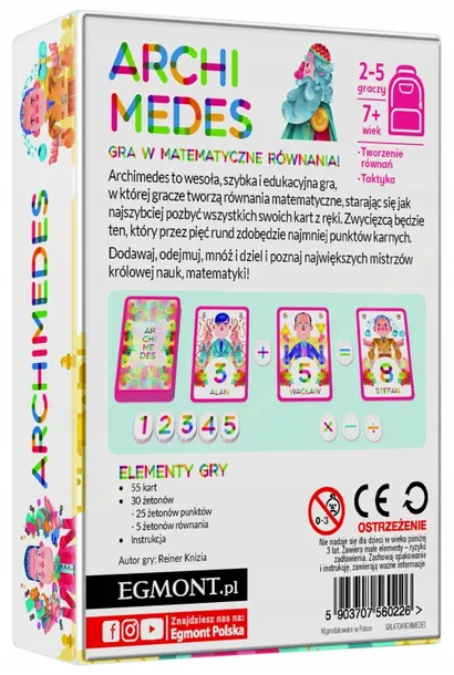 Gra w matematyczne ró ła, szybka i edukacyjna gra, w której gracze tworzą równania matematyczne, starając się jak najszybciej pozbyć wszystkich swoich kart z ręki. Gra „Archimedes” wspiera naukę matematyki oraz myślenia taktycznego. Poprzez dodawanie, odejmowanie, mnożenie i dzielenie młodzi gracze rozwijają swoje kompetencje matematyczne, doskonale się przy tym bawiąc. Na kartach w grze pojawiają się najwięksi matematycy w dziejach: Katherine Johnson, Zoltán Pál Dienes, Alan Turing, Malba Tahan, Emmy Noether, Sofja Kowalewska, Émilie Du Châtelet, Bhaskaraćarja, Muhammad Ibn Musa Al-Chuwarizmi, Hypatia z Aleksandrii i Archimedes oraz dwóch najsłynniejszych polskich uczonych: Stefan Banach, pionier analizy funkcjonalnej, który udowodnił twierdzenie o paradoksalnym rozkładzie kuli mówiące o tym, że trójwymiarową kulę można rozłożyć na fragmenty, a następnie złożyć z nich dwie kule o tych samych promieniach co promień kuli wyjściowej oraz Wacław Sierpiński, którego ogromny dorobek naukowy obejmował bardzo szeroki wachlarz zagadnień. Podczas wojny polsko-bolszewickiej brał udział w łamaniu radzieckich szyfrów. Był pionierem prac nad zbiorami samopodobnymi, takimi jak trójkąt Sierpińskiego i dywan Sierpińskiego. Obiekty te nazwano później fraktalami. Był jednym z założycieli pierwszego na świecie specjalistycznego czasopisma matematycznego poświęconego teorii mnogości i jej zastosowaniom oraz logice matematycznej. Gra może stać się zatem pretekstem do rozmowy o dokonaniach poszczególnych naukowców i ich znaczeniu dla rozwoju królowej nauk. Gra trwa pięć rund. W każdej rundzie gracze zagrywają karty matematyków, tworząc równania. Jeśli na zakończenie rundy gracz zostaje z kartami w dłoni, otrzymuje punkty karne. Wygrywa ten, kto po pięciu rundach będzie miał ich najmniej. Dodawaj, odejmuj, mnóż i dziel, i poznaj największych mistrzów królowej nauk – matematyki!Liczba graczy: 2-5 Wiek: 7+Elementy gry:55 kart matematyków 5 dużych żetonów symboli matematycznych25 żetonów punktów (po 5 z wartościami od 1 do 5)Archimedes - videoinstrukcja