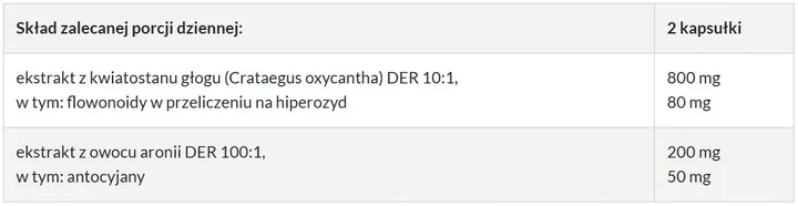 Składniki: ekstrakt z kwiatostanu głogu (Crataegus oxycantha) standaryzowany na 10% flowonoidów w przeliczeniu na hiperozyd, ekstrakt z owocu aronii standaryzowany na 25% antocyjanów, substancja glazurująca: pullulan.