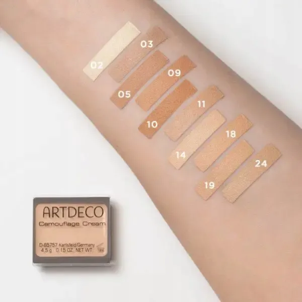 Możesz go nakładać palcami, pędzlem lub gąbeczką. Kosmetyk w idealny sposób maskuje przebarwienia, wypryski, cienie, a nawet żyłki i popękane naczynka – zapewnia maksymalne krycie. Doskonale sprawdzi się również jako trwały podkład. Kamuflaż Artdeco dobrze utrzymuje się na twarzy nawet w wysokich temperaturach. Łatwo się rozprowadza i nie gromadzi w załamaniach skóry. Jeśli chcesz uzyskać bardzo trwały, wodoodporny efekt nałóż grubą warstwę pudru utrwalającego i po 5-10 minutach usuń nadmiar pudru. Camouflage Cream dostępny jest w wielu kolorach, więc łatwo dopasujesz go do odcienia swojej cery.