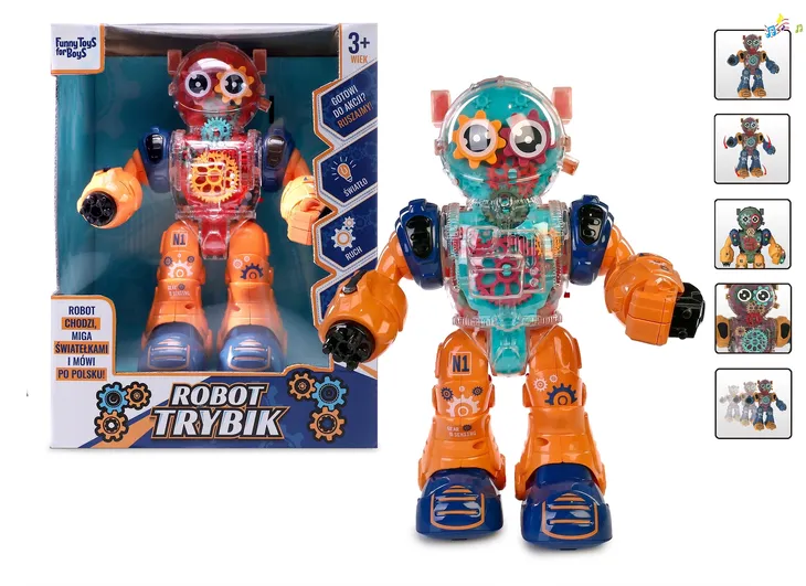 Trybik nie tylko porusza się i błyszczy, ale także odtwarza futurystyczne melodie, które przeniosą Twoje dziecko w świat nowoczesnych technologii. Robot wypowiada również frazy w języku polskim, np. „Gotowi do akcji?”, zachęcając do wspólnej zabawy. Trybik to doskonała zabawka dla każdego malucha, który uwielbia dynamiczne zabawy i fascynuje się światem robotyki!