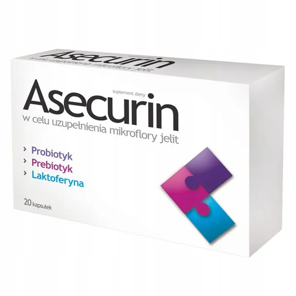 Suplement diety Asecurin zawiera dwa szczepy bakterii probiotycznych z rodzaju Lactobacillus, prebiotyk (inulinę) i laktoferynę z mleka. Jest zalecany w celu uzupełnienia i odbudowy mikroflory jelitowej w czasie i po leczeniu antybiotykami.