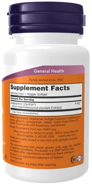 Astaxanthin 4 mg od Now Foods to suplement diety zawierający najwyższej jakości astaksantynę - niezwykły naturalny karotenoid. Jego unikalna budowa molekularna sprawia, że skutecznie chroni komórki przed szkodliwym działaniem wolnych rodników, zapewniając solidną ochronę antyoksydacyjną.