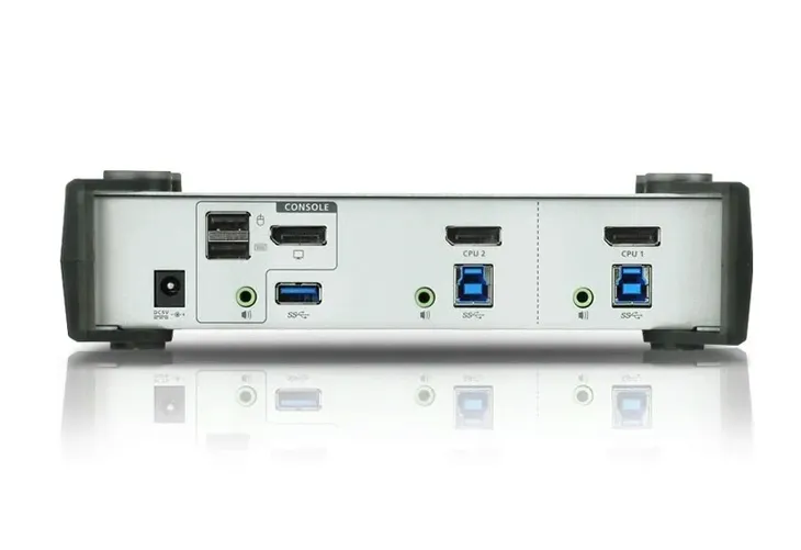 - Przełącznik 2-portowy DisplayPort KVMP™ z dźwiękiem przestrzennym 2.1 i koncentratorem USB 3.1 Gen 1