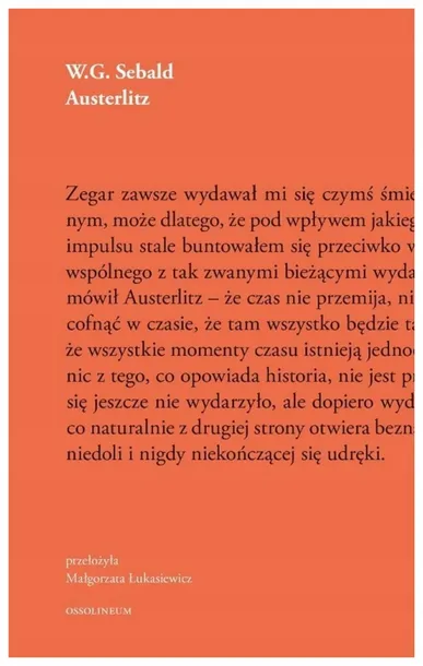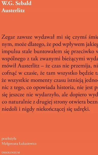 Szkatułkowa opowieść o wyobcowaniu i walce z niepamięcią. U progu drugiej wojny światowej pięcioletni Jacques Austerlitz trafia do Wielkiej Brytanii, gdzie adoptuje go dwoje walijskich protestantów. Wkrótce chłopiec poznaje jednak swoje prawdziwe nazwisko i kraj pochodzenia, a po latach jako dorosły mężczyzna rozpoczyna długą wędrówkę, na końcu której spodziewa się znaleźć klucz do zrozumienia własnej tożsamoś swój cichy, przesycony melancholią i ironią sposób ostatnia proza Sebalda należy do najważniejszych książek minionych dekad pisze w posłowiu do książki Wojciech Nowicki. Zawdzięcza to literackiej klasie, owej frazie, zdolnej unieść jej główne tematy: Zagładę, zagłady, niemożność dopasowania i pragnienie odosobnienia, potrzebę pamięci i niepamięć, świat ludzi wrogich wobec, jak uważają, istot niższych ras podległych i zwierząt; te ostatnie Sebald przedstawia jako często zmartwiałe lub od dawna już martwe preparaty, podobnie zresztą jak ludzi, których nagrobki, kości i duchy pozbawione widomego znaku, porzucone, spalone, zwidują się bohaterowi książ to powieść na wskroś aktualna, ze zdwojoną siłą przypominająca wydarzenia, które zbyt łatwo ulatują z pamięci ludzkości. Mimo że w książce tej wszystko wydaje się nadzwyczaj zrozumiałe, przejrzysta proza Sebalda kluczy i zwodzi, odkrywając coraz to nowe światy: te rzeczywiste i te wyobrażone.