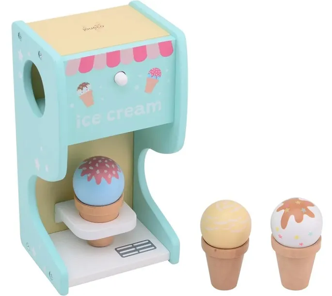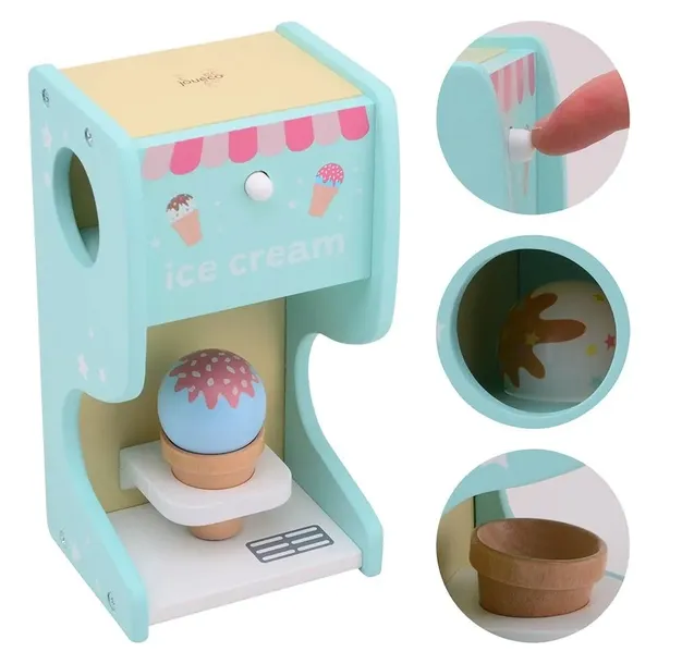 Drewniany automat do lodów Ice Cream pozwoli na super zabawę w lodziarnię o każdej porze roku! To doskonała zabawa dla całej rodziny i radość gwarantowana. Zabawka działa automatycznie – po wduszeniu przycisku pyszne kulki w polewą wyskakują wprost na wafelek – lody gotowe w sekundę. Wystarczy umieścić kulkę w górnej części lodziarni, podstawić wafelek na dole i nacisnąć! Uroczy pastelowy automat do lodów w kolorze pięknej mięty w połączeniu z kolorem różowym i lemon skradnie serca wszystkich i będzie się świetnie komponować w stylowym pokoju malucha. Świetna zabawa i jednocześnie nauka kreatywnego odgrywania ról, zabawka poprawia zdolności motoryczne, uczy koncentracji i stymuluje koordynację wzrokowo-ruchową.