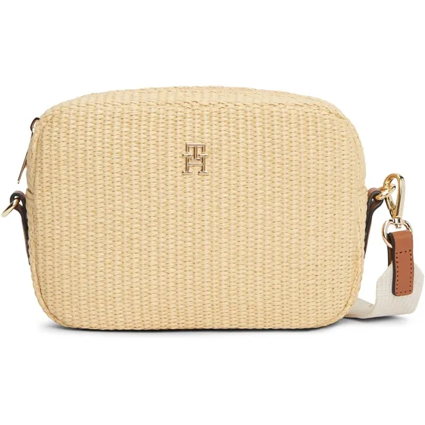 Ta torebka na ramię wyróżnia się teksturowanym wykończeniem z rafii i eleganckim monogramem TH, który dodaje jej uroku.
