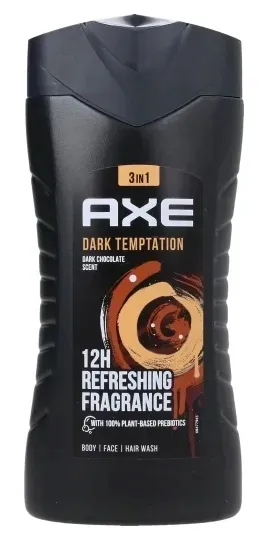 Żel pod prysznic AXE Dark Temptation posiada wyjątkowo męski zapach skomponowany z subtelnych nut – m.in. zmysłowej czekolady i bursztynu. Jego formuła skutecznie oczyszcza skórę, pozostawiając ją pełną uczucia świeżości. Żel pod prysznic AXE Dark Temptation idealnie uzupełniają pozostałe produkty z tej samej serii AXE. Dzięki wodzie toaletowej AXE Dark Temptation roztoczysz wokół siebie kuszący zapach, obok którego nikt nie przejdzie obojętnie, a dezodoranty sprawią, że będziesz czuł się świeżo nawet do 48 godzin.