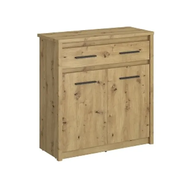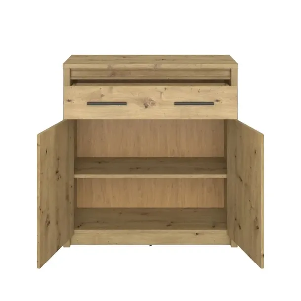 Czarne, metalwe uchwyty podkreślaja styl meble.