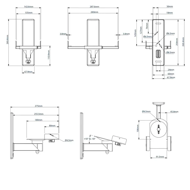 Uchwyty posiadają możliwości regulacji pochylenia o 7° w górę lub w dół (w pionie) oraz uchwyty można obracać do 180° (w poziomie), zapewniając idealne rozmieszczenie głośników i akustykę.