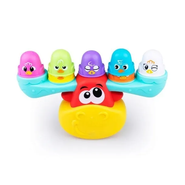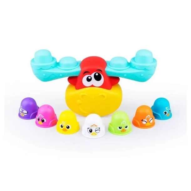 Hej maluchu, złap balans, ćwicząc równowagę z przezabawnym łosiem! Na jego imponującym porożu znajdzie się miejsce dla wszystkich kolorowych ptaszków, dołączonych do zestawu. Odpowiednio rozmieść te kolorowe kubeczki na obu stronach poroża, aby znajdowały się one względem siebie w równowadze. Jeśli umieścisz zbyt wiele kubeczków na jednej stronie, łoś przechyli się w tym kierunku. Uważaj, jeśli obarczysz go zbyt dużym ciężarem i przechyli się zbyt mocno w jedną stronę, zrzuci kubeczki! To jeszcze nie wszystko! Kubeczkowe ptaszki posiadają na głowie dziurki, dzięki czemu sprawdzą się też do zabawy w piasku czy podczas kąpieli.