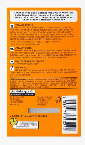 Balea Vitamin C Concentrate jest rozpieszczającym specjalnym produktem pielęgnacyjnym z aktywnymi składnikami. Dostarcza skórze cennych składników, które zapewniają jej ukierunkowane wsparcie dla odświeżonego, świeższego wyglądu oraz odżywia ją koktajlem witamin C i E jako prawdziwym wzmacniaczem urody. Formuła Glow z olejkiem pomarańczowym nawilża i ma działanie antyoksydacyjne. Aktywny składnik collageneer może stymulować produkcję własnego kolagenu w skórze przy regularnym stosowaniu. Aksamitna konsystencja i orzeźwiający cytrusowy zapach dodatkowo rozpieszczają zmysły.