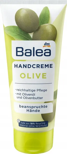 Oliwkowy krem do rąk Balea zapewnia delikatną i odżywczą pielęgnację skóry dłoni. Dzieki zawartości czystego masła oliwnego i pantenolu krem regeneruje nawet najbardziej zniszczoną i suchą skórę. Uczucie napięcia ustępuje, a dłonie stają się przyjemnie miękkie i gładkie. Formuła z naturalną oliwą z oliwek, cennym masłem oliwnym i pantenolem intensywnie pielęgnuje skórę dłoni. Produkt nie zawiera mikroplastiku i rozpuszczalnych w wodzie polimerów syntetycznych.