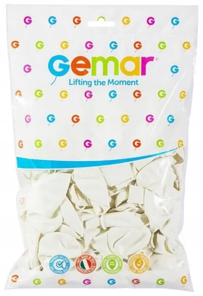 Wymiar balonów w calach: 10 Wymiar balonów w centymetrach: ok. 25 cm Ilość sztuk w opakowaniu: 100 Kolor: pastel biały Włoskiego producenta - firmy Gemar. Posiadają odpowiedniej długości końcówkę więc nie ma problemów z ich wiązaniem.