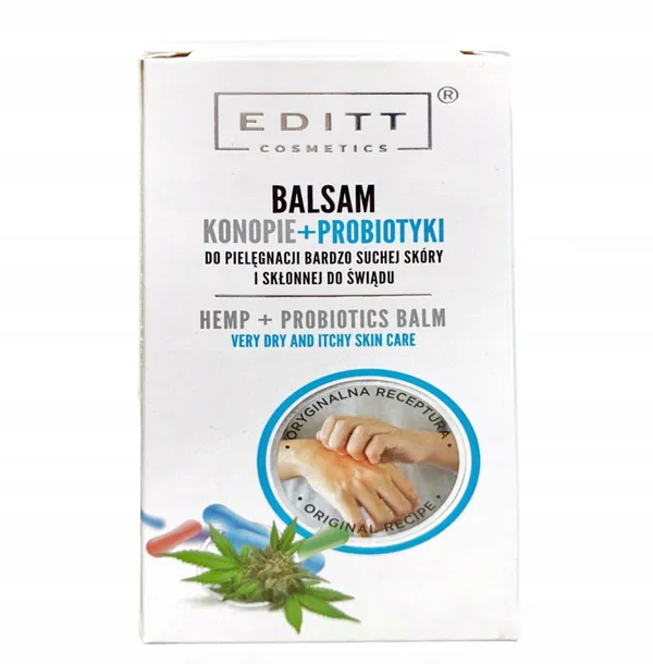 Balsam KONOPIE + PROBIOTYKI marki EDITT Cosmetics intensywnie nawilża, regeneruje i wspiera naturalną odporność skóry. Bioaktywne molekuły probiotyczne odbudowują barierę ochronną naskórka, poprawiają jego elastyczność i przyspieszają proces regeneracji.