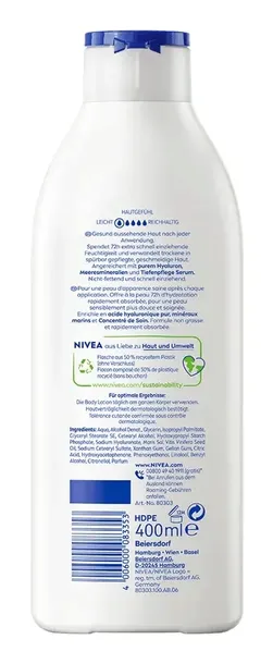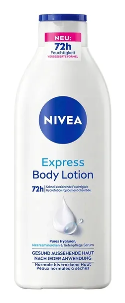 Balsam do ciała NIVEA Express Body Lotion to idealne rozwiązanie dla osób, które oczekują od balsamu do ciała czegoś więcej niż tylko nawilżenia. Szybko wchłania się w skórę, nadaje jej elastyczność i zapewnia naturalnie piękne piękno. Balsam do ciała szybko się wchłania i jest wzbogacony o głęboko pielęgnujące serum NIVEA oraz minerały morskie. Już po jednym zastosowaniu lekka, szybko wchłaniająca się formuła sprawia, że Twoja skóra staje się zauważalnie gładsza i intensywnie nawilżona przez 72 godziny. Efekt, który nie tylko poczujesz, ale i zobaczysz.
