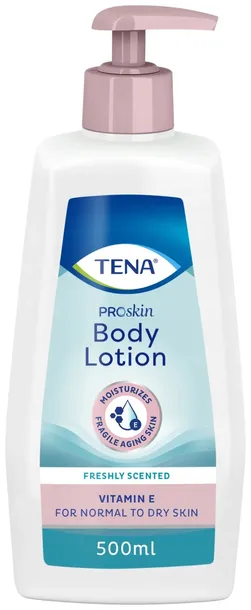 TENA ProSkin Skin Lotion to mleczko nawilżające z witaminę E wzbogacone naturalnymi składnikami nawilżającymi. Stosować do całego ciała – zwłaszcza po prysznicu lub kąpieli. Mleczko pozostawia skórę gładką i miękką oraz utrzymuje naturalne pH skóry.