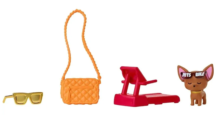 Lalka ubrana jest w białe kabaretki, połyskującą spódnicę i bluzkę z wzorem w chmurki, a oryginalne dodatki, takie jak torebka kształcie kamienia szlachetnego, duże kolczyki, czy łańcuszek, uzupełniają jej unikalną stylizację. Barbie posiada mieniące się włosy w kolorze różowym i fioletowym, a ich długość to aż 21 cm! W zestawie z lalką znajduje się także biały piesek, któremu oczy przysłania grzywa. Pupil ma założoną obrożę z napisem "Boss". W zestawie znajduje się łącznie 15 akcesoriów.