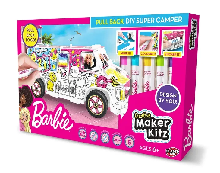 Myśl kreatywnie i kolorowo! Stwórz swój wymarzony kamper prosto od Barbie. Dzięki 5 dołączonym do zestawu markerom i naklejkom nadasz mu własny, wyjątkowy styl. Ale najpierw… musisz go samodzielnie złożyć! Kamper Barbie posiada aż dwa mechanizmy, które pozwolą mu odjechać i razem z Tobą zwiedzać świat! I pamiętaj: You Can Make Anything! W zestawie znajdują się: 4x arkusze do pokolorowania, 5x marker, 2x zestawy kół, 2x arkusz naklejek, 1x instrukcja