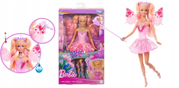 Barbie Wróżka Lalka z różdżką i akcesoriami modowymi, baśniowy motyw i zmiana koloru na skrzydełkach i stroju Z tą lalką Barbie czeka Cię magiczna barwna transformacja. Zamocz różdżkę z gąbeczką w zimnej wodzie, a potem przetrzyj skrzydełka, aby zmienić serduszka z różowych w czerwone Przesuń różdżką z gąbeczką po gorsecie lalki i zachwyć się efektem ombre. Użyj ciepłej wody, aby wrócić do pierwotnego wyglądu. Tę kolorową transformację możesz powtarzać wciąż od nowa. Lalka Barbie Wróżka nadaje blasku każdej przygodzie, którą podpowie Ci wyobraźnia, w swojej sukience, bucikach na obcasie z motywem pnączy, opasce do włosów i naszyjniku z zawieszką w kształcie kropelki wody. Kolory i elementy dekoracyjne mogą się różnić.