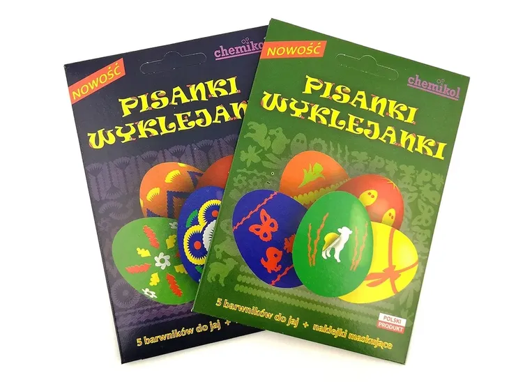 Zestawy naklejek maskujących i 5 barwników do jaj. Pozwala na pomalowanie jajka w wielokolorowe wzory – tradycyjne bądź dziecięce.