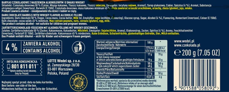 Baryłki czekoladowe z nadzieniem alkoholowym o smaku whisky 200g.