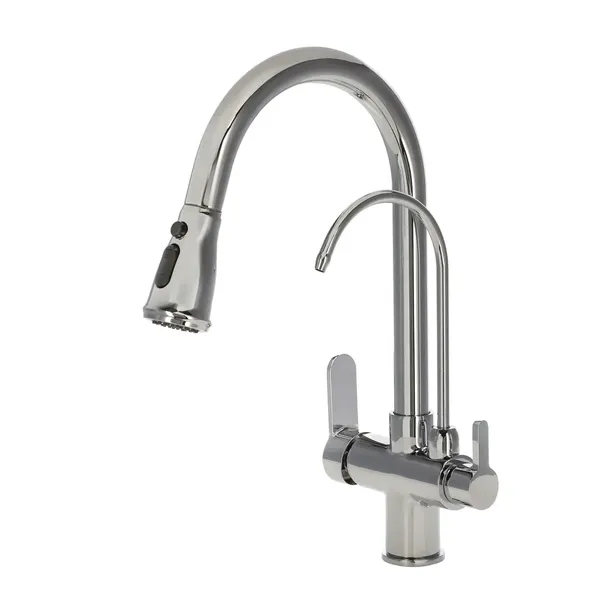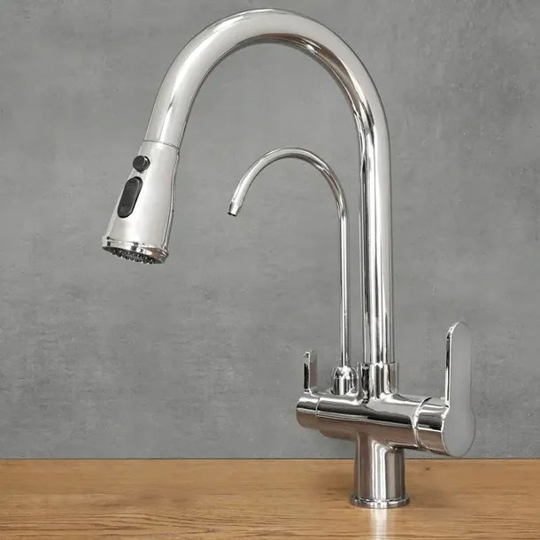 Elegancka i funkcjonalna bateria, która będzie pasować do kuchni w stylu nowoczesnym. Bateria została utrzymana w kolorze chrom oraz posiada prostą formę, co sprawia, że sprawdzi się również w aranżacjach loftowych i industrialnych. Kran jest modelem bardzo funkcjonalnym dzięki dodatkowemu kranikowi na wodę filtrowaną. Bateria posiada również wyjmowaną wylewkę z możliwością zmienienia strumienia wody ze stałego w prysznic. Kran ze względu na swoje duże wymiary wpasuję się w kuchnie o dużej przestrzeni.