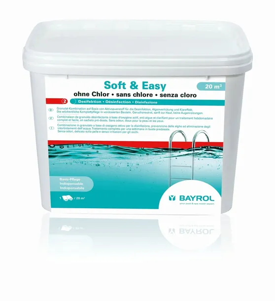 Jedna podwójna saszetka Soft&Easy przeznaczona jest do dezynfekcji wody i ograniczania rozwoju alg w basenie (wannie z hydromasażem) o objętości wskazanej na opakowaniu przez okres około 7 dni, jednakże przy pierwszym dozowaniu należy użyć 2 podwójnych saszetek. Następnie co tydzień należy dozować 1 podwójną saszetkę na objętość wody wskazaną na opakowaniu.