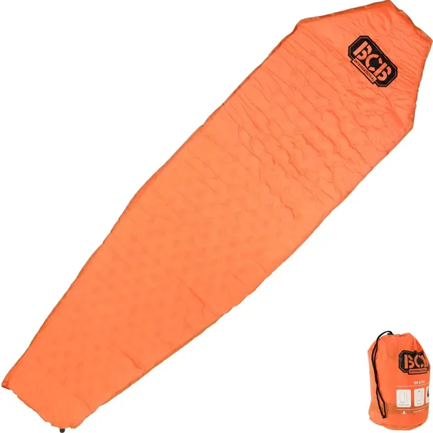 Zaawansowana karimata samopompująca, do profesjonalnego użytku. Doskonała dla osób ceniących wygodę, praktyczność i lekki bagaż. Polecana miłośnikom, trekkingu, outdooru i wspinaczki górskiej. Niezastąpiona pod namiotem, na biwaku lub kempingu. Kompaktowa i bardzo lekka, zmieści się w niewielkim plecaku lub torbie. Niewłaściwe odizolowanie od zimnego podłoża grozi chorobami układu limfatycznego i mięśniowo - szkieletowego. Materac wypełniony powietrzem i pianką, doskonale separuje od zimnego podłoża. Ciepło ciała jest przekazywane uwięzionym w materacu cząstkom gazu, karimata "grzeje" od dołu. Dodatkowa, wewnętrzna warstwa miękkiej, porowatej pianki pełniącej kilka ważnych funkcji. Strukturalna pianka z wycięciami w kształcie "karo", pozwala zmagazynować więcej ogrzanego powietrza. Perforacja zmniejsza wagę karimaty. Pianka stanowi dodatkową izolację w miejscach obciążonych przez ciało. Sprężysty materiał powraca do swojej pierwotnej objętości zaraz po odkręceniu wentyla, zasysa powietrze z atmosfery by wypełnić materac. Ściśliwe wypełnienie umożliwia składanie do kompaktowych wymiarów. Materac dwustronny, dwa rodzaje materiałów zewnętrznych - łatwo zmywalna oraz grubsza, antypoślizgowa. Tkanina jest odporna na wodę, pleśń i brud. Trwały materiał zewnętrzny 210T Poliester Rip-Stop powleczony od wewnątrz filmem PVC. Pomarańczowa strona doskonale spisuje się na podłożach błotnistych i brudnych, jest łatwo zmywalna. Jaskrawy kolor może pełnić role ostrzegawczą lub przyciągać uwagę służb ratowniczych. Strona w kolorze szarym wykonana z grubego materiału 210T Poliester Rip-Stop z antypoślizgowym wykończeniem Diamod. Fakturowana powierzchnia zabezpiecza przed zsuwaniem się śpiwora z materaca. Grubszy materiał sprawdza się przy układaniu materaca na kamienistej, betonowej i śliskiej powierzchni lub w miejscach gdzie zachodzi ryzyko uszkodzenia materaca. Zawór wykonany z wytrzymałego tworzywa. Gumowy O-ring gwarantuje szczelność. Szerokie zgrzewy zapewniają wytrzymałość. Karimata opatrzona logiem BCB. Materac wyposażony w wodoodporny pokrowiec. Elastyczny trok kompresyjny ułatwiający zwijanie. W komplecie zestaw naprawczy z łatkami i specjalnym klejem.