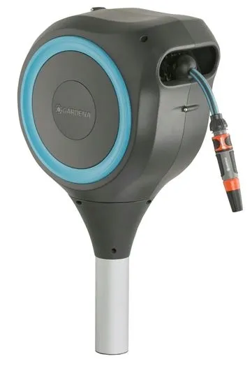 Zwijanie węża nie wymaga użycia siły, kręcenia korbą i brudzenia rąk. Na wyposażeniu bębna jest wąż ogrodowy 11 mm o długości 15 metrów, wąż przyłączeniowy o długości 2 metrów, wszystkie niezbędne części przyłączeniowe systemu Gardena oraz zraszacz prosty z dwiema opcjami strumienia wody. Montaż bębna przy pomocy dołączonego mocowania naściennego, śrub oraz kołków jest łatwy i szybki.
