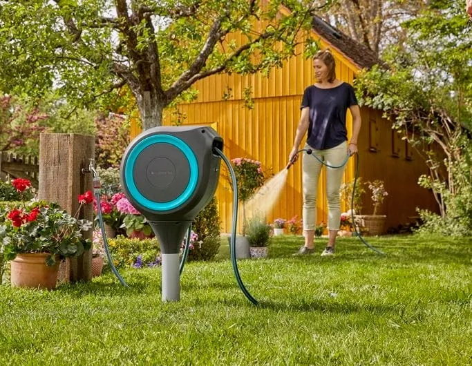Zwijanie węża nie wymaga użycia siły, kręcenia korbą i brudzenia rąk. Na wyposażeniu bębna jest wąż ogrodowy 11 mm o długości 15 metrów, wąż przyłączeniowy o długości 2 metrów, wszystkie niezbędne części przyłączeniowe systemu Gardena oraz zraszacz prosty z dwiema opcjami strumienia wody. Montaż bębna przy pomocy dołączonego mocowania naściennego, śrub oraz kołków jest łatwy i szybki.