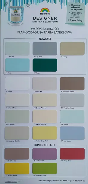 Wysokiej jakości, matowa farba lateksowa polecana do stosowania w pomieszczeniach szczególnie narażonych na uporczywe zabrudzenia np. kuchnie, korytarze, ciągi komunikacyjne oraz działanie wilgoci jak np. łazienki.