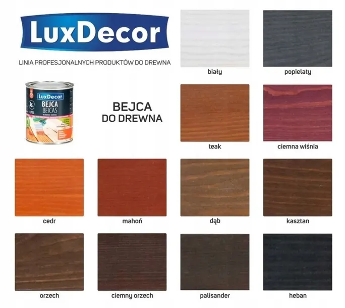 Bejca do drewna Lux Decor przeznaczona jest do barwienia dekoracyjnego drewna i produktów drewnopodobnych wewnatrz pomieszczeń
