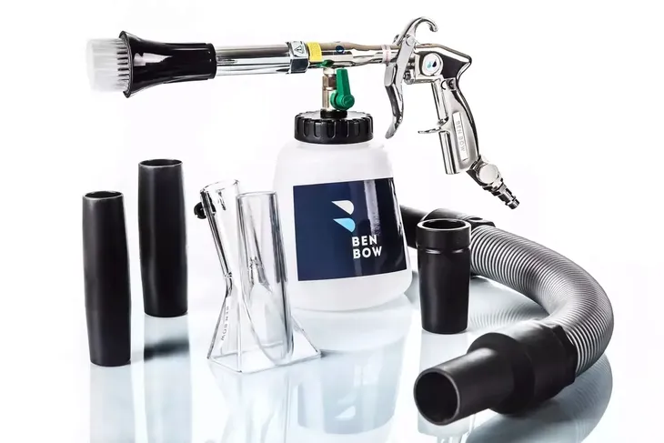 BenBow Vacuum Washer to kolejna pozycja wśród pistoletów typu tornado gun. Tuba ze szczotką świetnie sprawdza się do czyszczenia materiałów oraz tworzyw sztucznych. W zestawie znajduje się również nakładka oraz zestaw węży i reduktorów do odkurzacza, dzięku której można wykonać pranie ekstrakcyjne! Jedyne czego potrzebujesz to tradycyjny odkurzacz, z możliwością zbierania wody. Urządzenie posiada zbiornik na chemię, która podawana jest pod ciśnieniem na czyszczoną powierzchnię. Vacuum Washer posiada plastikowy mechanizm, który podaje sprężone powietrze i chemię, dzięki czemu urządzenie jest jeszcze mocniejsze od wersji klasycznej z plastikowym wężykiem.
