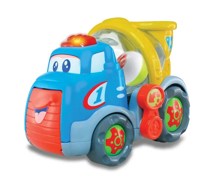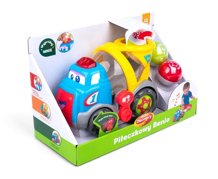 Poznaj uśmiechniętego kumpla na 4 kółkach, który śpiewa po polsku i wyrzuca piłeczki! Aby uruchomić piosenkę, naciśnij na czerwony guzik umieszczony na dachu pojazdu. Swobodny ruch kół umożliwia prowadzenie zabawki rączką. Z boku betoniarki znajduje się sprytna dźwignia. Przesuń ją w przód, aby opuścić klapę i obserwuj jak Benio wyrzuca piłeczkę!
