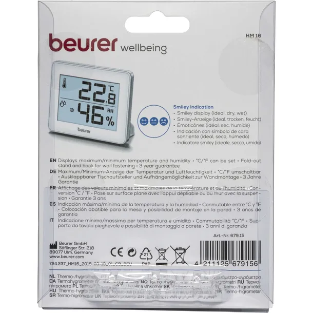 Beurer HM 16 to precyzyjny higrometr i termometr, który pozwala na łatwe monitorowanie temperatury oraz wilgotności powietrza w pomieszczeniach. Urządzenie jest proste w obsłudze i wyposażone w czytelny wyświetlacz.