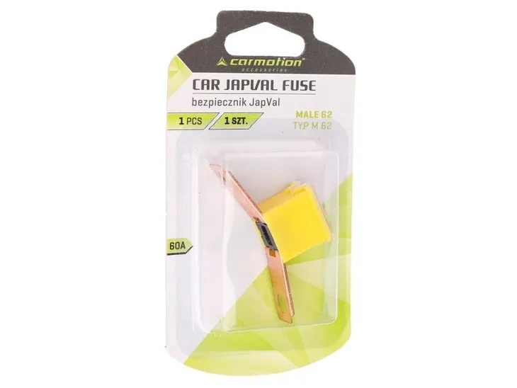 Bezpiecznik elektryczny samochodowy JAPVAL TYP 62 M o amperażu 60A, który chroni instalacje elektryczne przed ich uszkodzeniem z powodu wystapienia nadmiernego natężenia prądu.