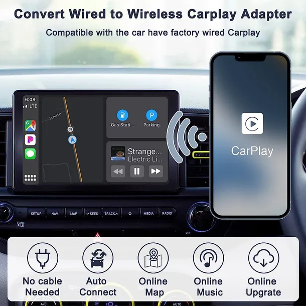 Ten bezprzewodowy adapter Carplay może zsynchronizować APP iPhone'a z wyświetlaczem samochodowym, a także jest doskonale kompatybilny z oryginalnymi metodami sterowania samochodem, takimi jak dotyk ekranu, przyciski i pokrętła. Umożliwia bezprzewodowe korzystanie ze wszystkich oryginalnych funkcji car play, w tym korzystanie ze sterowania głosowego, Siri, muzyki online, aplikacji do nawigacji GPS, aplikacji muzycznej, połączeń telefonicznych i wiadomości.