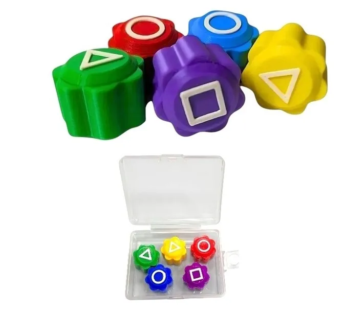 5 kolorowych kości ozdobionych symbolami nawiązującymi do Squid Game. Nadają grze niepowtarzalny klimat i przyciągają uwagę.