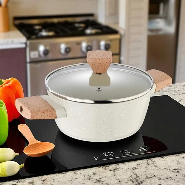 Powłoka jest bezpieczna dla zdrowia — nie zawiera szkodliwych substancji (PFOA, PTFE, ołowiu ani kadmu). To idealny wybór dla osób, które szukają trwałego, nowoczesnego i estetycznego rozwiązania w swojej kuchni.