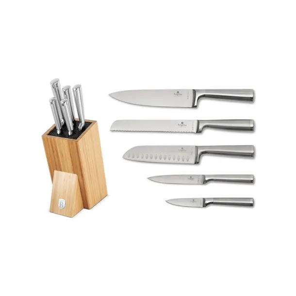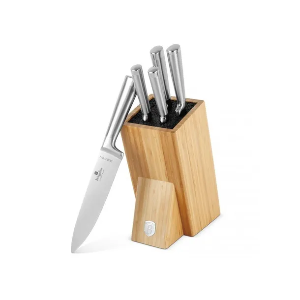 6 elementowy zestaw noży bloku bambusowym firmy BERLINGER HAUS z serii Black Silver. Przeznaczone do porcjowania mięsa i ryb, krojenia pieczywa oraz obierania i siekania warzyw. Noże wykonane wysokiej jakości stali nierdzewnej Ferrinox 18/10 o wysokiej zawartości węgla 1.4028/X30Cr13. Istotną cechą tej stali jest fakt, że jest odporna na wszelkiego rodzaju zadrapania, zarysowania, charakteryzuje się zwiększoną odpornością na ścieranie i korozję. Wyposażone w uchwyty pokryte bardzo trwałą cienką warstwą silikonu dla uzyskania pewnego trzymania w każdych warunkach. Noże drewnianym bambusowym bloku. Całość stanowi niebanalny element dekoracyjny w każdej kuchni. Zestaw zawiera wszystkie niezbędne noże do codziennego przygotowywania posiłków.W zestawie: