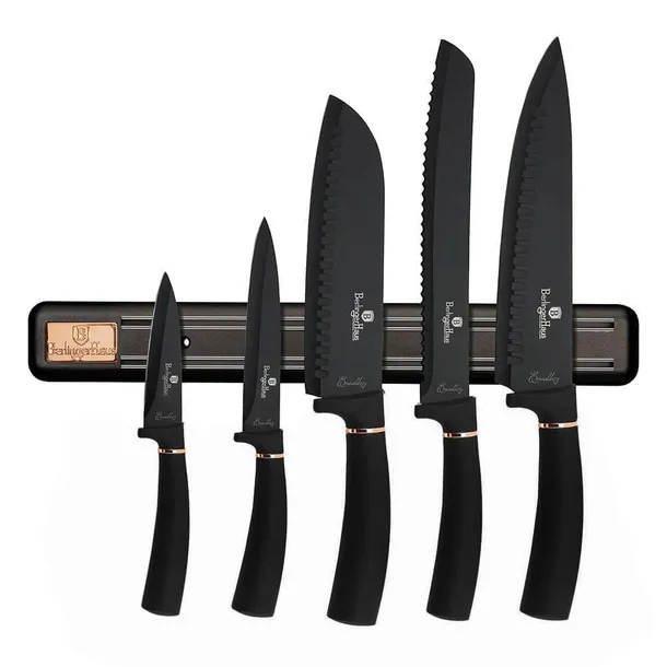 Zestaw noży 6 elementów firmy BERLINGER HAUS z serii z serii BLACK ROSE. Noże ze stali nierdzewnej dodatkowo pokryte powłoką anty-przywierającą wysokiej klasy. Wyposażone w uchwyty pokryte bardzo trwałą cienką warstwą silikonu dla uzyskania pewnego trzymania w każdych warunkach.