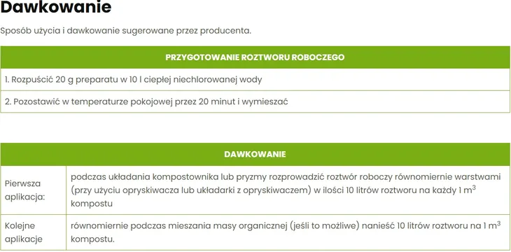 Aby zapewnić optymalne działanie preparatu, należy rozpuścić 20 gramów bi compost w 10 litrach ciepłej wody bez chloru, a następnie pozostawić roztwór w temperaturze pokojowej na 20 minut. Po upływie tego czasu należy dokładnie wymieszać roztwór i równomiernie rozprowadzić go po powierzchni kompostowanej masy. Wilgotność kompostu powinna wynosić co najmniej 60%, aby bakterie mogły efektywnie działać. W przypadku niższej wilgotności należy dodatkowo nawilżyć kompost wodą.