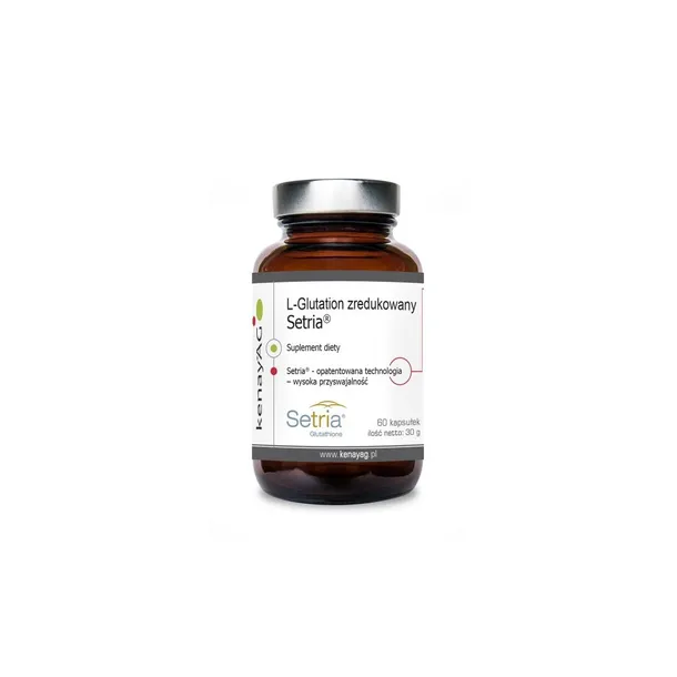 Setria<sup>® </sup>- opatentowana technologia – wysoka przyswajalność.Składniki:l-glutation (zredukowany); otoczka kapsułki: hydroksypropylometyloceluloza. <table><tbody><tr><td colspan="2">Porcja dzienna:1 kapsułkaOpakowanie zawiera:60 kapsułek </td></tr><tr><td colspan="2">Skład w porcji dziennej (1 kapsułka)Glutation /Setria<sup>®</sup>/ (l-glutation zredukowany)500 mgSetria<sup>® </sup>- opatentowana technologia – wysoka przyswajalnośćGlutation jest tripeptydem zbudowanym z trzech aminokwasów – kwasu glutaminowego, glicyny i cysteiny. Peptyd ten jest powszechnie znany jako silny antyoksydant, którego zadaniem jest chronić wszystkie komórki naszego organizmu przed uszkodzeniami powodowanymi przez wolne rodniki.Setria<sup>®</sup> jest zarejestrowanym znakiem towarowym KYOWA HAKKO BIO CO., LTD.Sposób użycia:1 kapsułka dziennie, podczas posiłkuUwagi:Nie należy przekraczać zalecanej porcji do spożycia w ciągu dnia. Suplementy diety nie mogą być stosowane jako substytut (zamiennik) zróżnicowanej diety. Nie należy stosować w przypadku nadwrażliwości na jakikolwiek składnik preparatu. Preparatu nie powinny stosować kobiety w ciąży, karmiące piersią oraz dzieci i młodzież poniżej 18 roku życia.Sposób przechowywania : przechowywać w zamkniętym opakowaniu w temperaturze pokojowej, w sposób niedostępny dla małych dzieci.