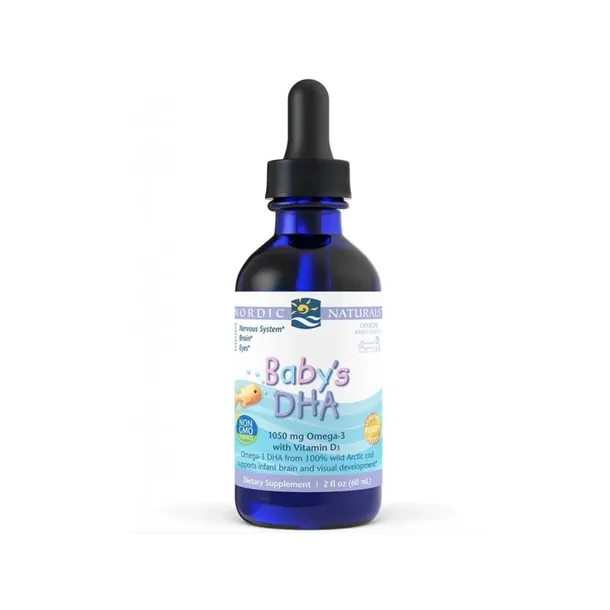 Baby's DHA jest źródłem kwasów tłuszczowych Omega-3, których potrzebuje dziecko do zdrowego rozwoju mózgu, oczu i układu nerwowego.SKŁAD:SkładnikiW dziennej porcji (5 ml)Kalorie 45 kcal Całkowita zawartość tłuszczu5 g Kwasy tłuszczowe Omega-3: 1050 mg - DHA (kwas doksaheksaenowy) 485 mg - EPA (kwas eikozapentaenowy) 350 mg - inne Omega-3 215 mg Witamina A 276 mcg Witamina D3 7.5 mcgInne składniki: oczyszczony olej z wątroby arktycznego dorsza, substancja konserwująca: ekstrakt z rozmarynu, przeciwutleniacz: d-alfa-tokoferol, cholekalcyferol w oliwie z oliwek.SPOSÓB UŻYCIA:Dla dzieci od 3 lat i więcej:- o masie 11.5 - 13.5 kg: 4 ml- o masie 13.5 - 16 kg: 5 mlPRZECIWWSKAZANIA:Zachowaj ostrożność chcąc stosować ten produkt, jeśli dziecko jest uczulone na jod, przyjmuje leki rozrzedzające krew lub przewidywana jest operacja.SPOSÓB PRZECHOWYWANIA:Przechowywać w suchym i chłodnym miejscu - najlepiej w lodówce - w sposób niedostępny dla małych dzieci.Najlepiej zużyć w ciągu 3 miesięcy od otwarcia.