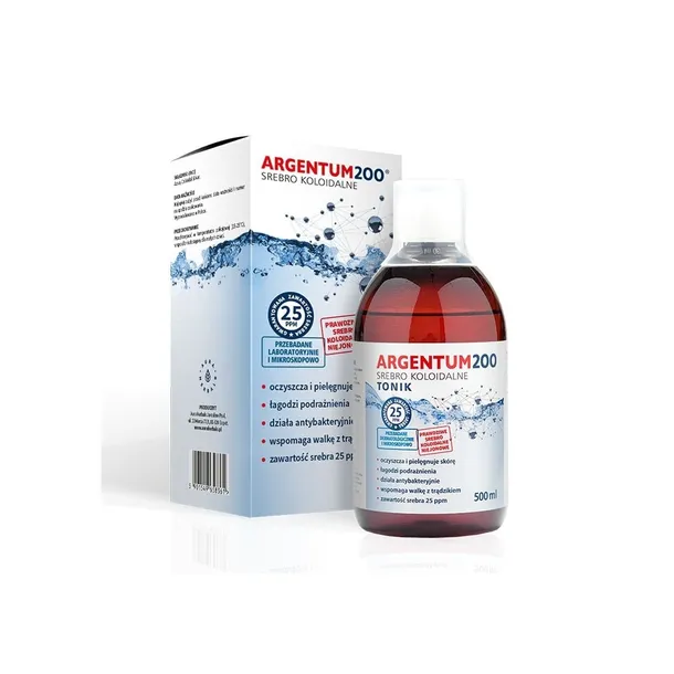 ARGENTUM 200 25 ppm – KOSMETYK SREBRO KOLOIDALNE (TONIK)<span>Srebro o wartości </span> 25 ppm <span> posiada zweryfikowaną laboratoryjnie i mikroskopowo zawartość srebra: 25 cząsteczek srebra na 1.000.000 cząsteczek wody (parts per million).</span><br /><br /><span>Argentum200 Srebro Koloidalne to kosmetyk o wysokiej zawartości czystego srebra koloidalnego na bazie najczystszej demineralizowanej wody. Dzięki wysokiej i potwierdzonej zawartości oraz odpowiedniej wielkości cząsteczek srebra działa na skórę!To znakomity tonik odpowiedni dla każdego typu cery. Odświeża i oczyszcza. Produkt przebadany dermatologicznie oraz mikroskopowo!</span><br /><br /><span>Wysoka zawartość srebra w Argentum200 została potwierdzona profesjonalnym badaniem pod mikroskopem elektronowym.</span><br /><br /> Działanie:<br /> <span></span> <ul><li>oczyszcza i pielęgnuje skórę</li><li>łagodzi podrażenienia i zaczerwienienia</li><li>pozostawia skórę czystą i zmatowioną</li><li>reguluje wydzielanie sebum</li><li>zawartośc srebra koloidalnego 25 ppm</li><li>zawarte srebro koloidalne wykazuje unikalne działanie antybakteryjne</li><li>wspomaga walkę z trądzikiem</li></ul>PRZECHOWYWANIE <br /><span>Przechowywać w suchym i chłodnym miejscu. Nie wystawiać na bezpośrednie działanie promieni słonecznych. Nie zamrażać.</span><br /><br /><br /> SKŁAD <br /><span>Aqua, colloidal silver.</span>Sposób użyciaNa gazę lub płatek kosmetyczny nanieść niewielką ilość produktu. Delikatnie przecierać skórę. Dla uzyskania najlepszego efektu stosować 2x dziennie - rano i wieczorem. Dołączona do opakowania miarka pozwala na samodzielne przygotowanie rozcieńczeń produktu.PrzeciwwskazaniaProdukt nie powinien być używany przez osoby uczulone na srebro i kobiety w ciąży.UWAGA: Widoczne cząstki w roztworze są zjawiskiem naturalnym. Spowodowane jest to tym, że cząstki koloidu rozpuszczone w wodzie czasem łączą się w cząstki tworząc widoczne układy koloidalne, nie stanowi to wady produktu.
