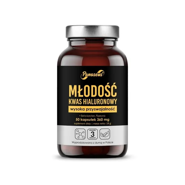 substancja wypełniająca: celuloza mikrokrystaliczna, beta karoten, hialuronian sodu (kwas hialuronowy), ekstrakt z owoców czarnego pieprzu BioPerine® (Piper nigrum) standaryzowany na min. 95% zawartości piperyny. Skład kapsułki: celuloza roślinna