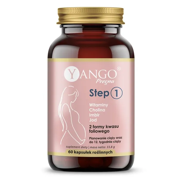 YANGO - Pregna Step 1, dla kobiet w ciąży i planujących ciążę, wspiera regulację hormonów, prawidłowe funkcjonowanie tarczycy oraz łagodzi dolegliwości występujące w pierwszych miesiącach ciąży.