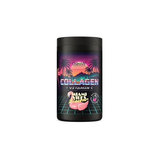 OstroVit Kolagen + Witamina C o smaku Miami Vibes to wysokiej jakości suplement diety w formie proszku. Preparat stanowi źródło hydrolizowanego kolagenu wołowego, który wyróżnia się lepszą rozpuszczalnością niż inne formy związku, a także egzogennej witaminy C. Tym samym odżywka rekomendowana jest w szczególności wśród sportowców, którzy wykazują zwiększone zapotrzebowanie na te składniki.