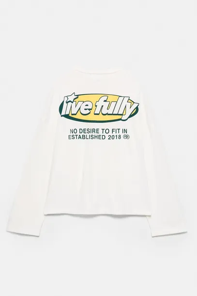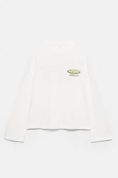 Biała koszulka z kontrastową grafiką i tekstem na plecach i z przodu, z długim rękawem, okrągłym dekoltem i wykonana z bawełny.