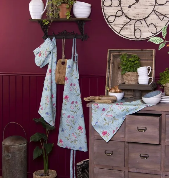 Podstawa ma piękny, jasnoniebieski kolor, który dodatkowo podkreśla motywy kwiatowe. Wszystkie przedmioty z tej serii dodają nie tylko koloru, ale także czystej radości do wnętrza. Piękne wzory zostały zastosowane między innymi na fartuchach kuchennych, obrusach, serwetkach i koszykach na chleb, a pasujące poduszki dekoracyjne i poduszki na krzesła dodają jeszcze więcej koloru do pomieszczenia. W tym motywie nie powinno również zabraknąć pasującego kubka. Postaw na kolor i radość i wybierz tę serię Bloom Like Wildflowers.</p>